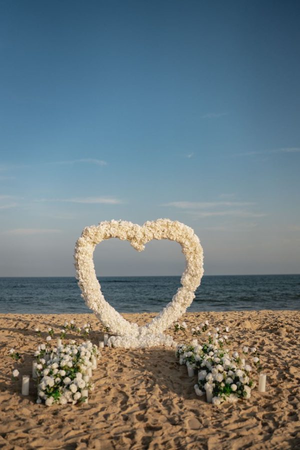 - Elegant Flower Arch setup (7.5 ft) with LED sign, carpet, six bundles of roses, and LED candles. Travel fee may vary, depending on the location.